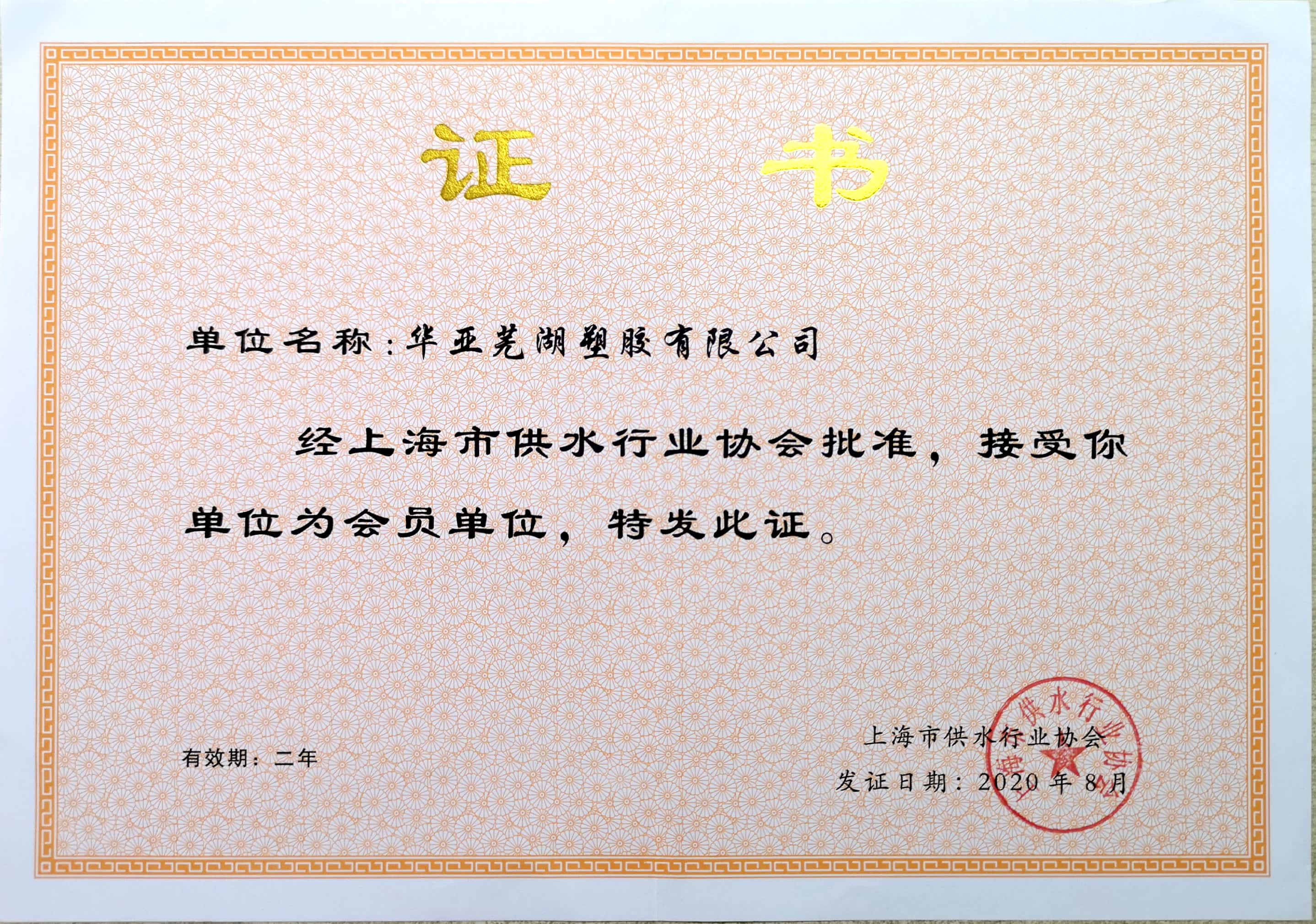 上海市供水行业协会证书